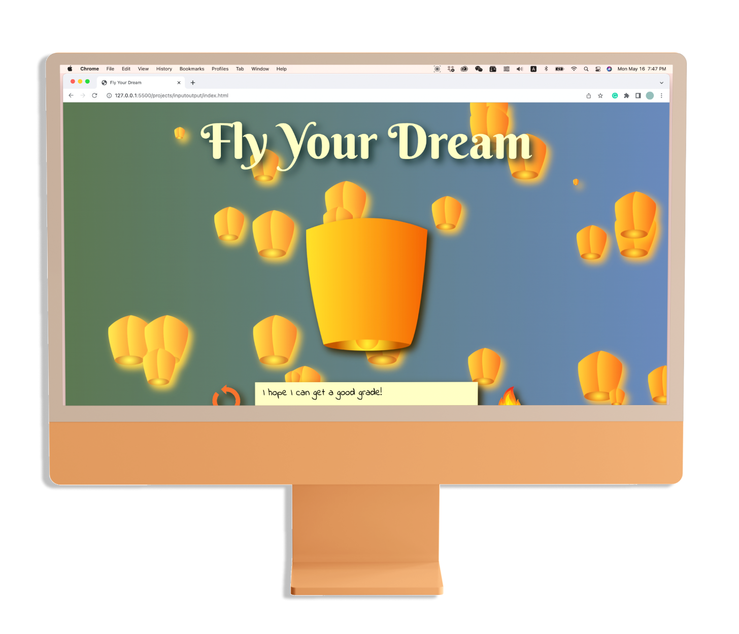 Input & Output Website DesignFly Your Dream is an interactive website inspired by the Chinese traditional lantern, a symbol of good fortune. The website is designed for those who wish to let go of their troubles and make a secret wish. Typing specific words activates secret-colored lanterns.