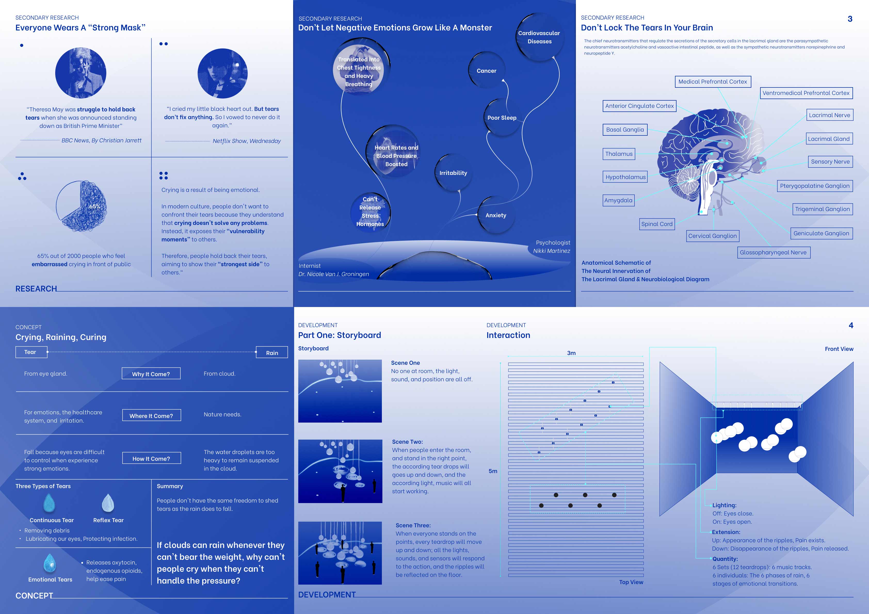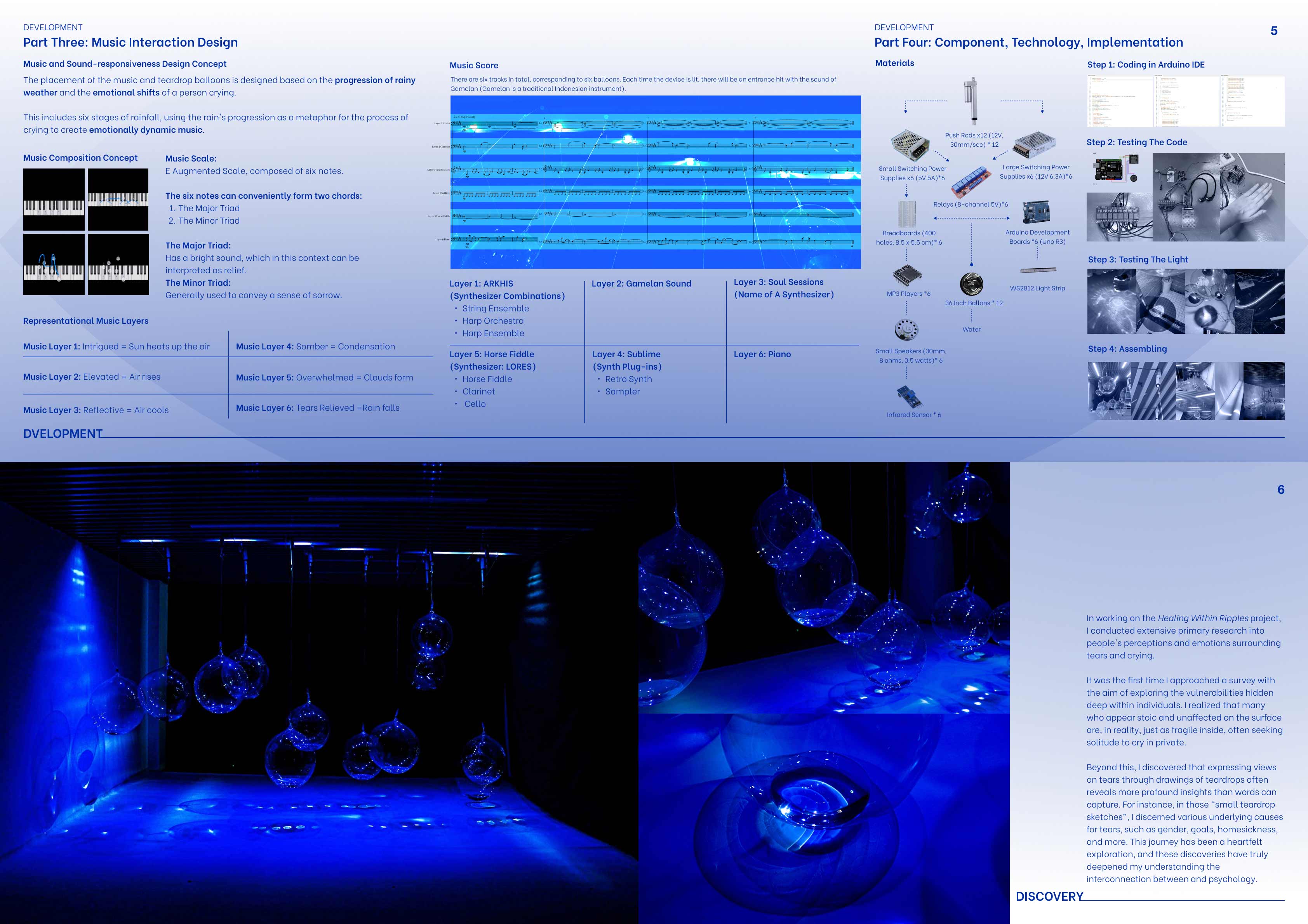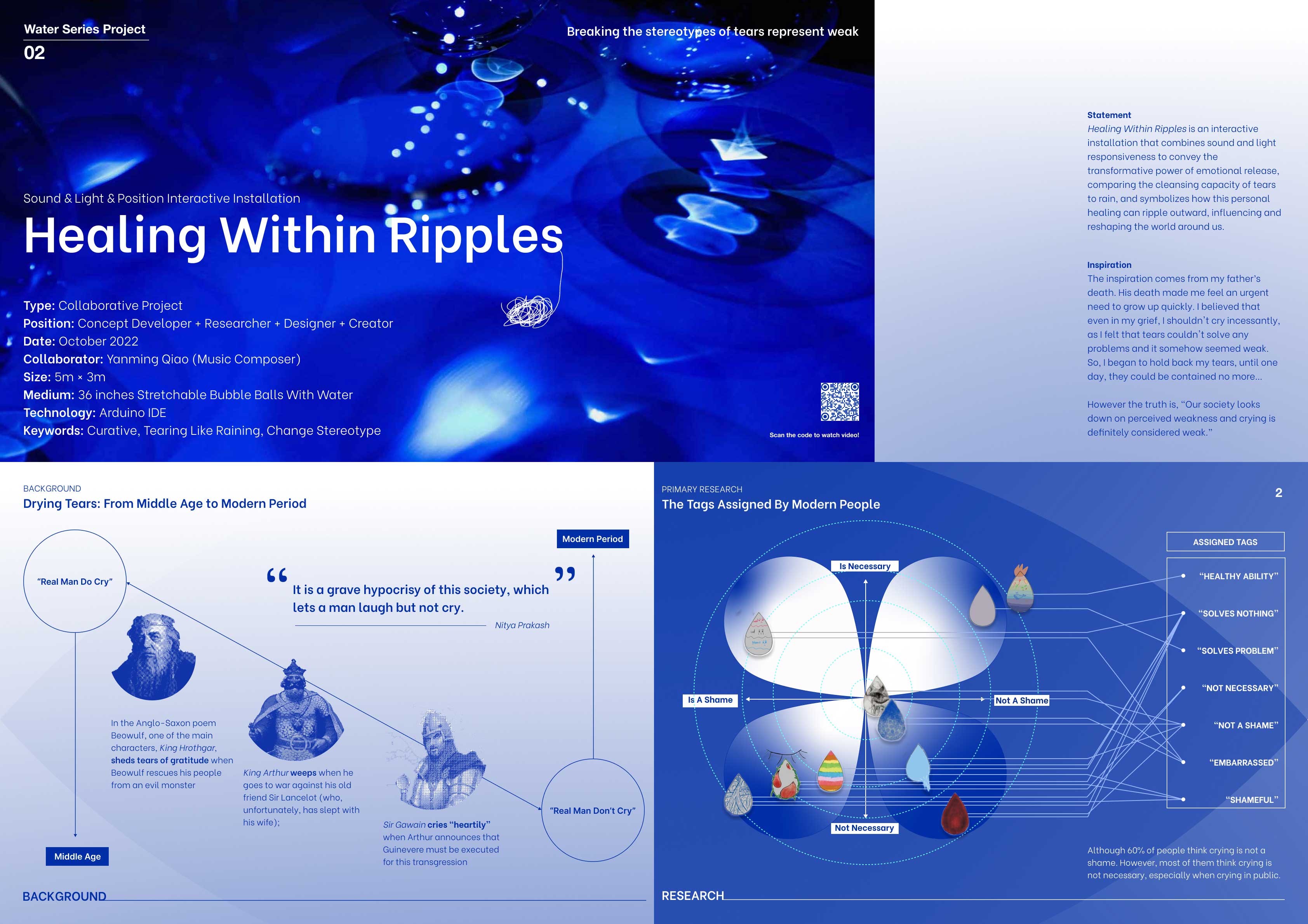 Healing Within Ripples is an interactive installation using sound and light to explore the transformative power of emotional release, likening tears to rain that cleanse and ripple outward to reshape the world. Inspired by my father’s death, the work reflects on my struggle to suppress grief in a society that views crying as weakness, until the emotions could no longer be contained.