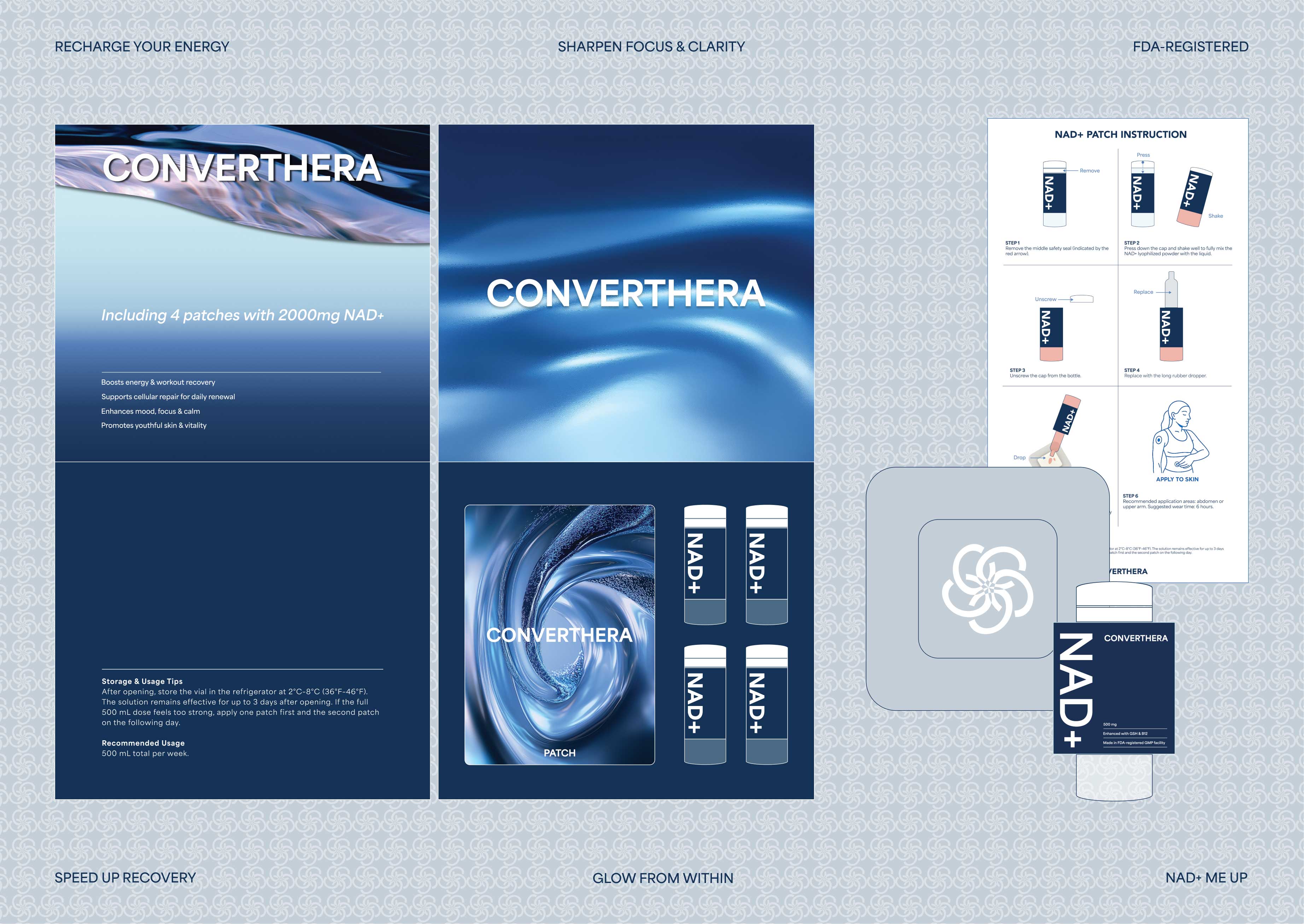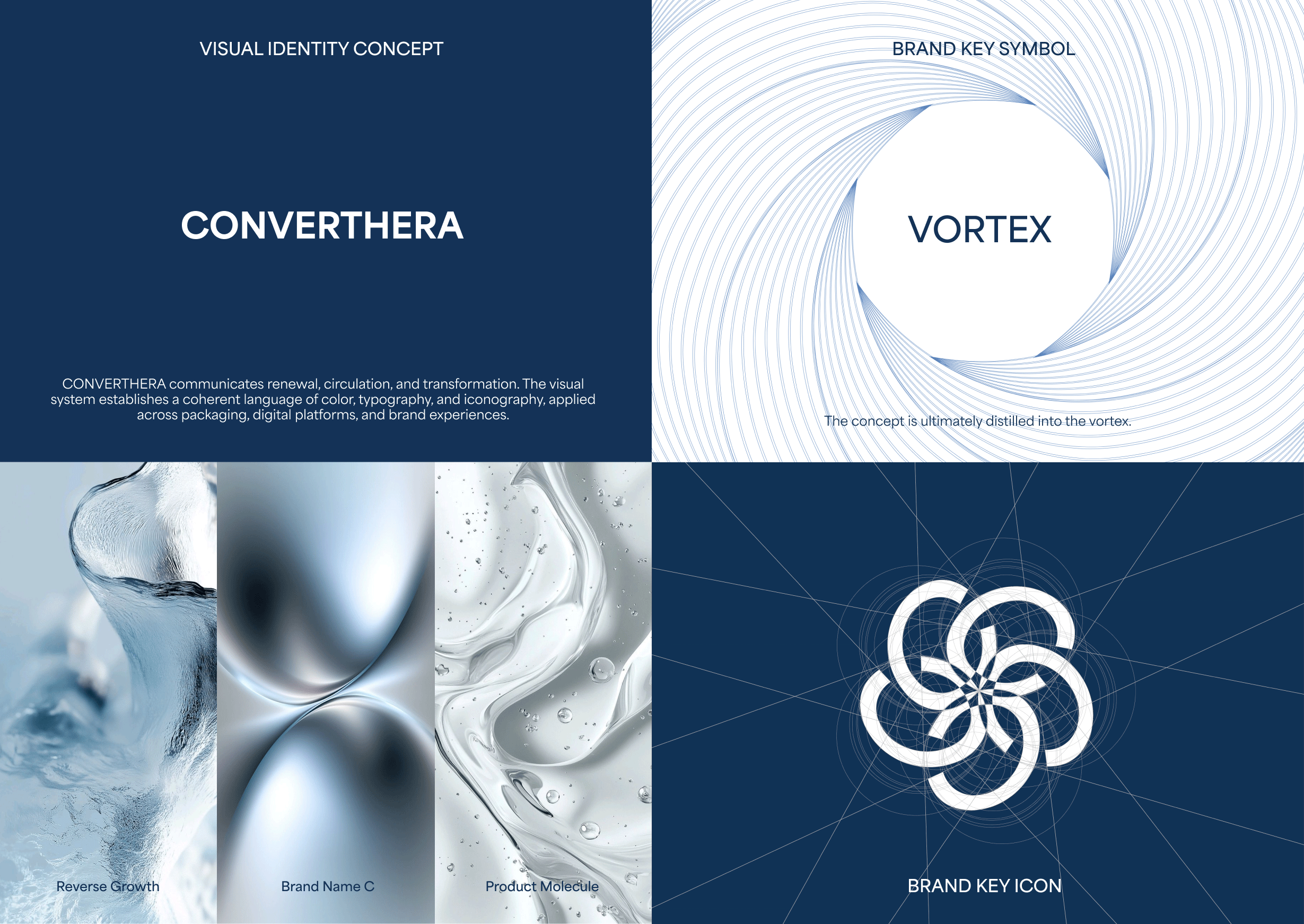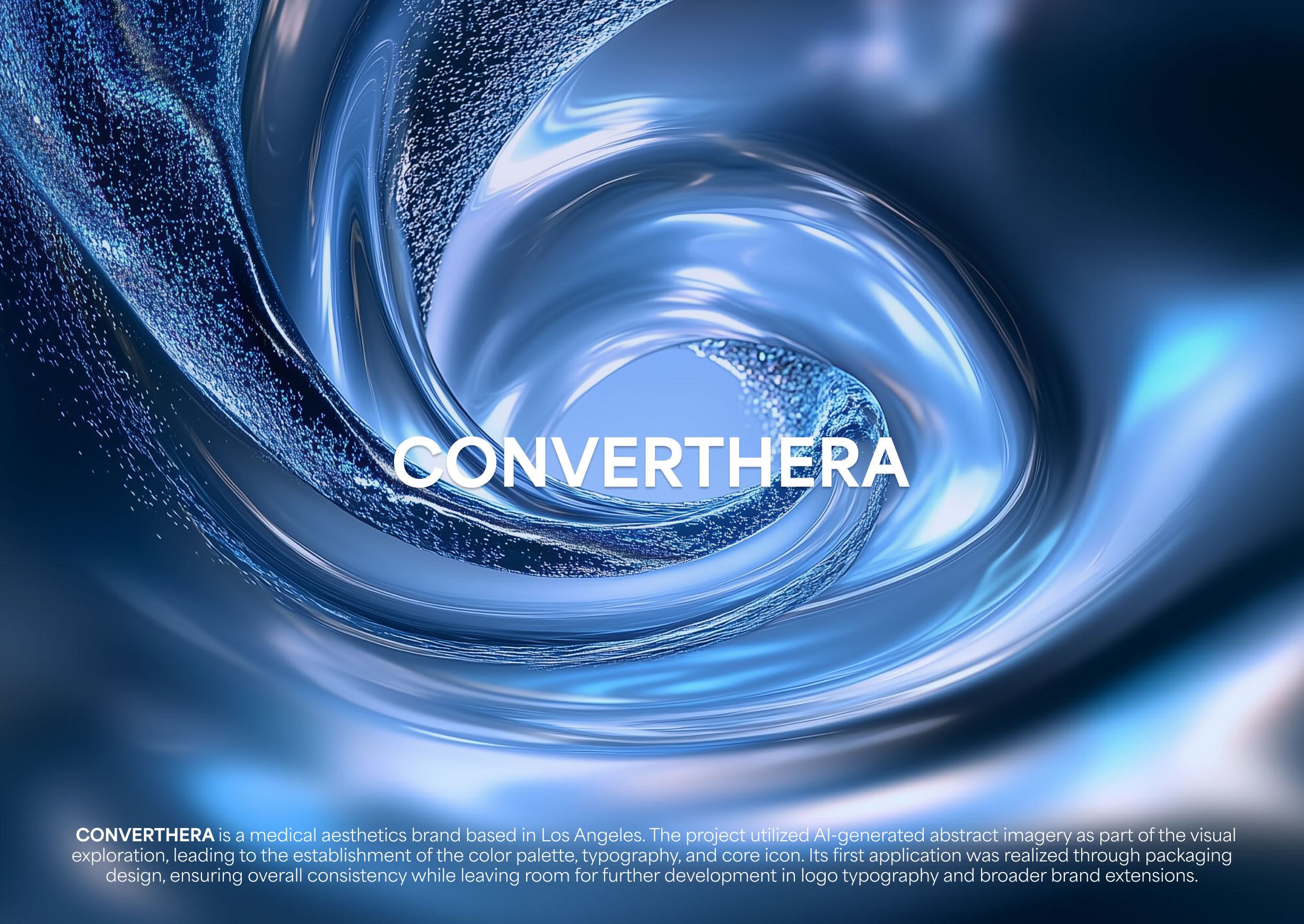 CONVERTHERA is a medical aesthetics brand based in Los Angeles. The project utilized AI-generated abstract imagery as part of the visual exploration, leading to the establishment of the color palette, typography, and core icon. Its first application was realized through packaging design, ensuring overall consistency while leaving room for further development in logo typography and broader brand extensions.