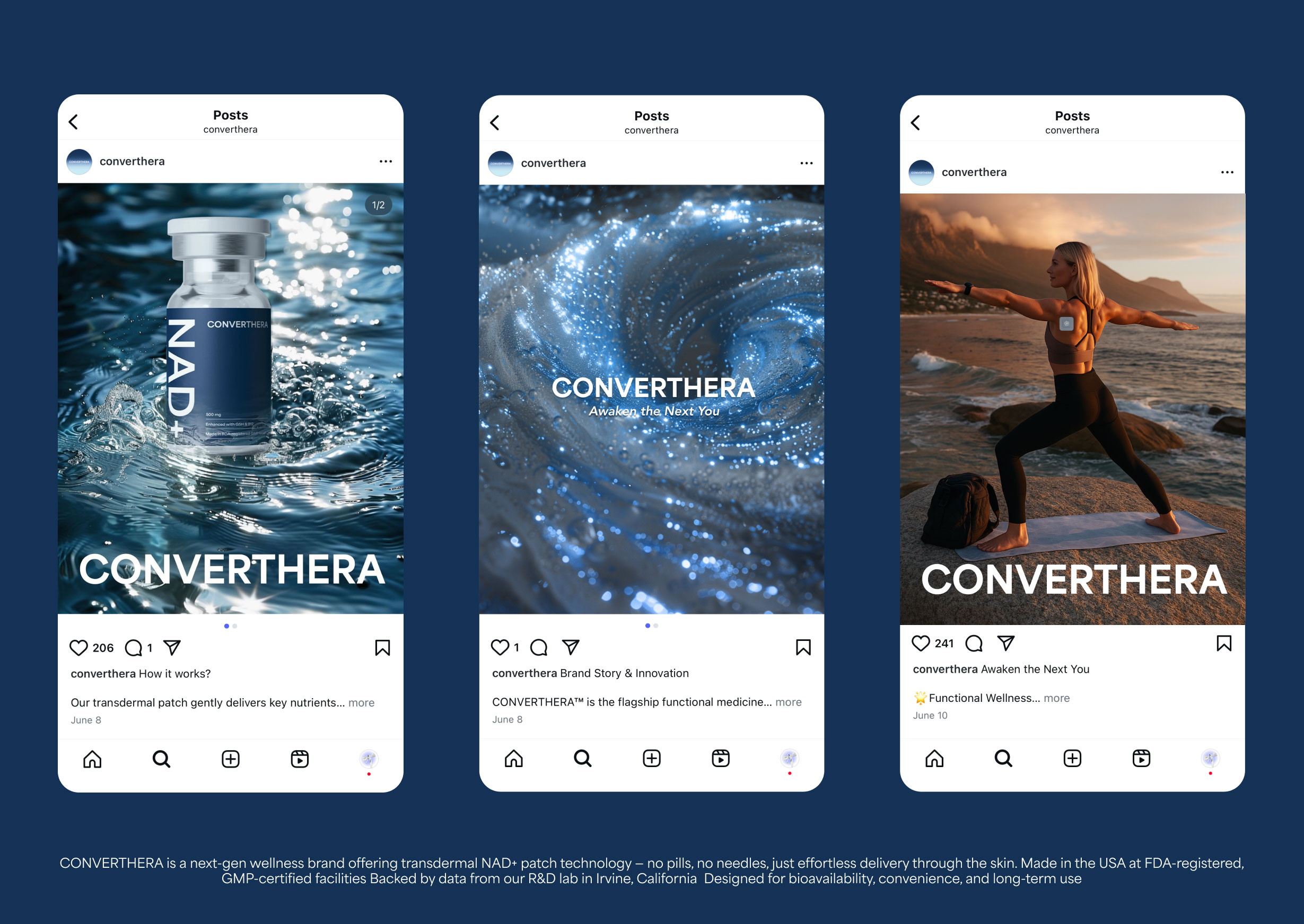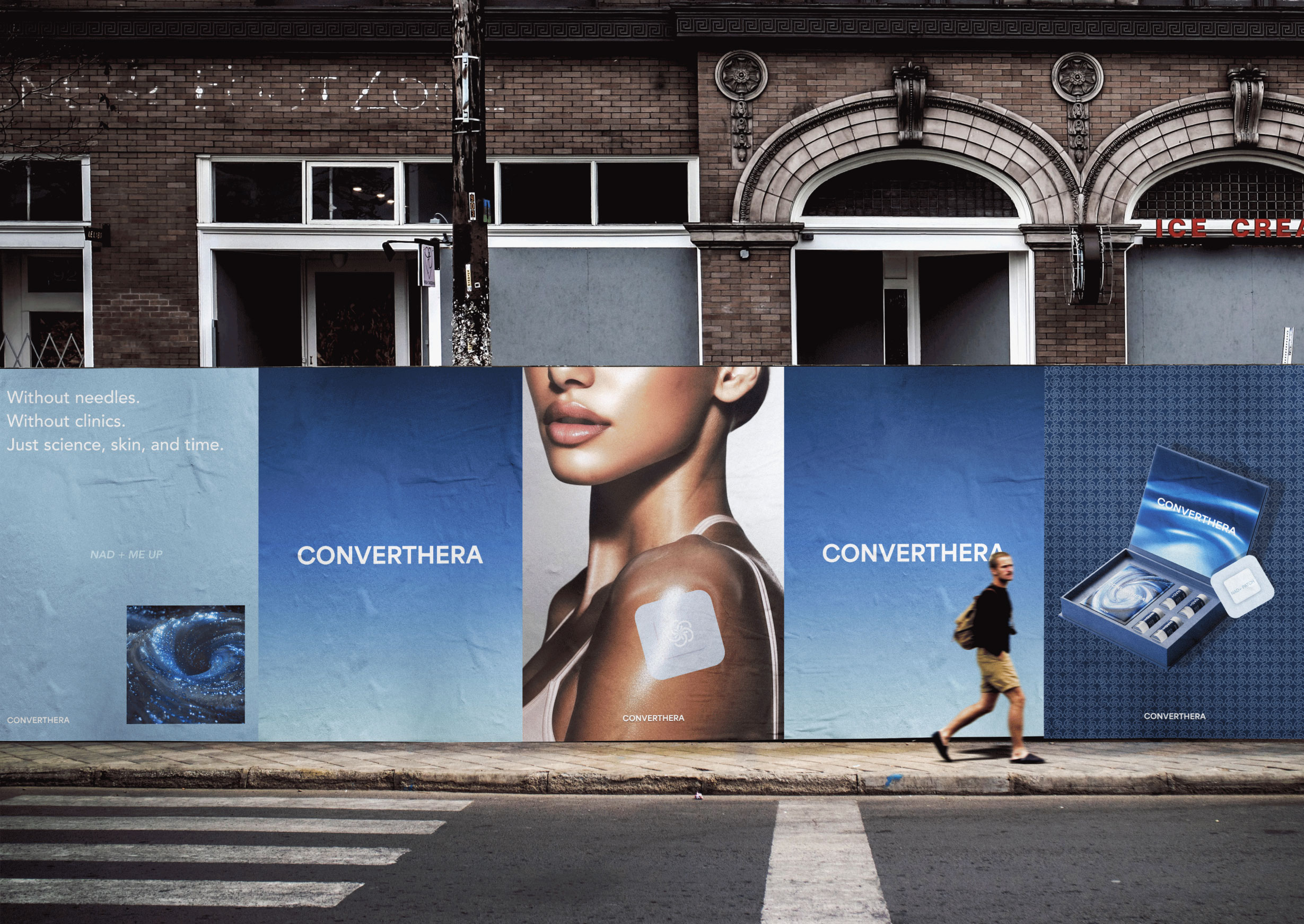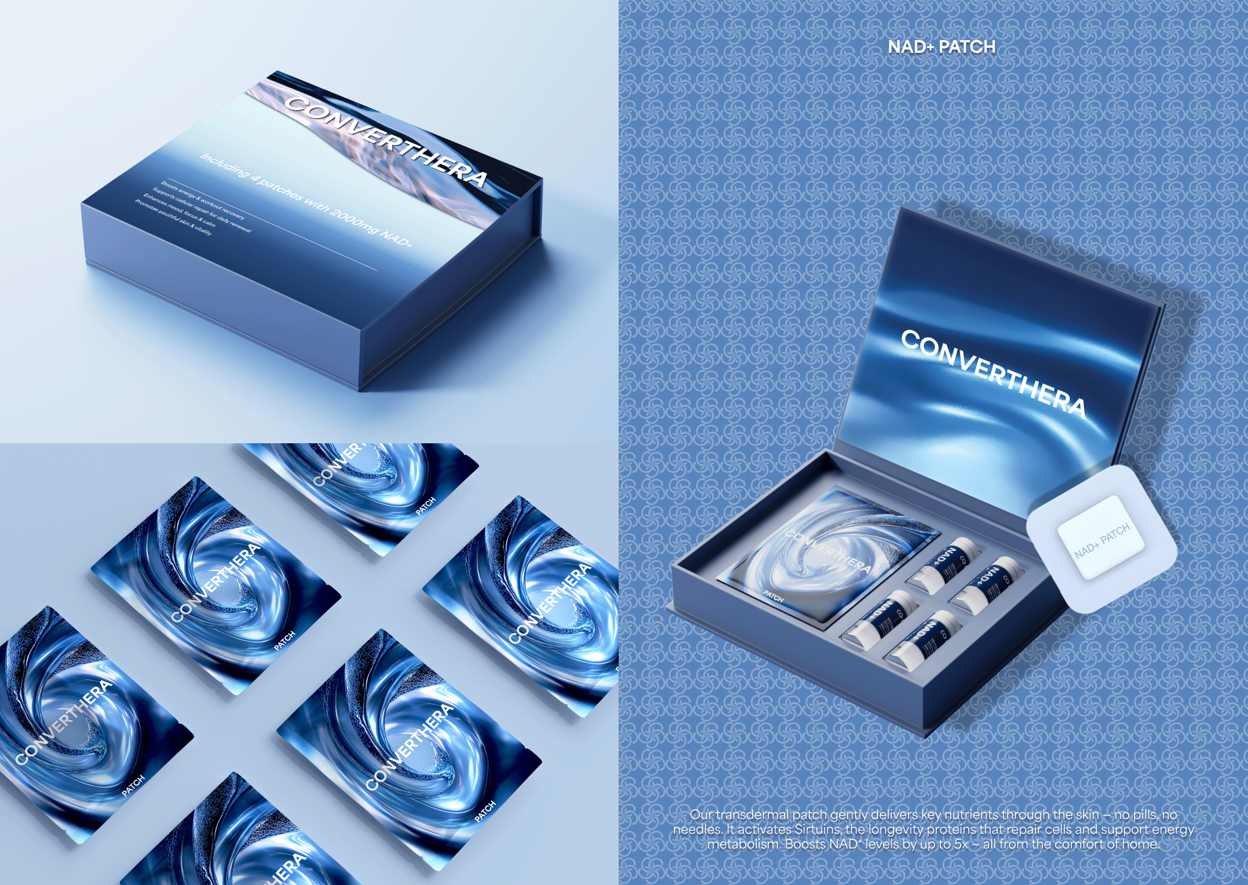 CONVERTHERA is a medical aesthetics brand based in Los Angeles. The project utilized AI-generated abstract imagery as part of the visual exploration, leading to the establishment of the color palette, typography, and core icon. Its first application was realized through packaging design, ensuring overall consistency while leaving room for further development in logo typography and broader brand extensions.
