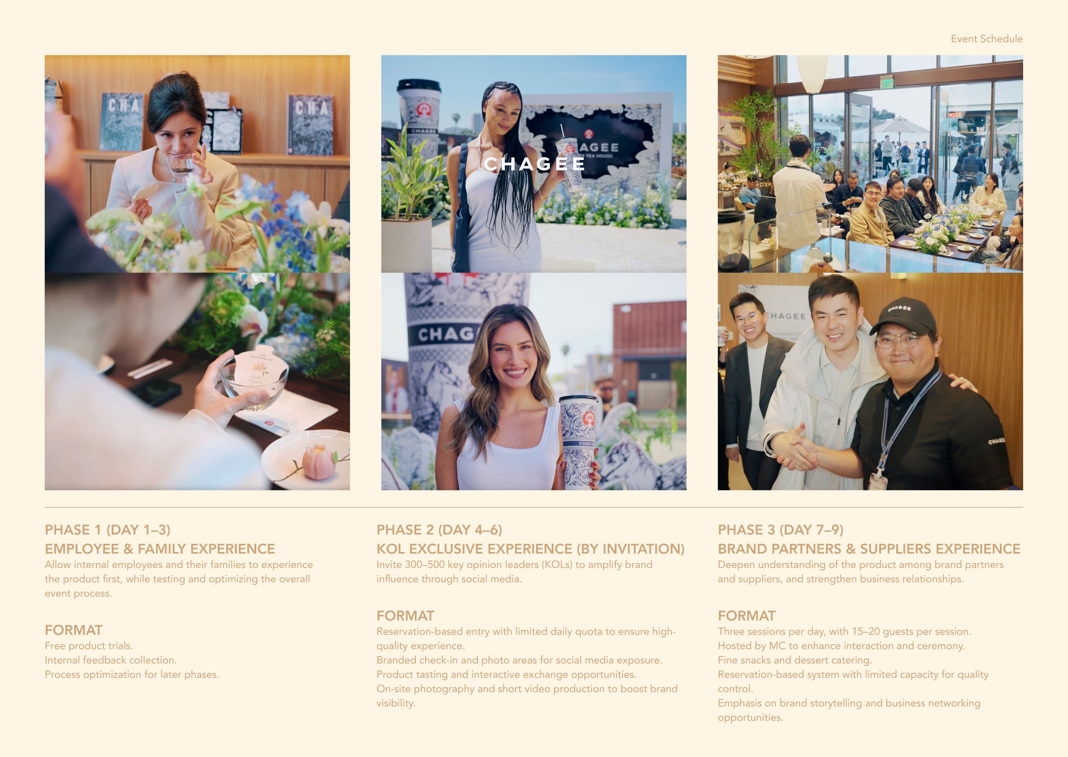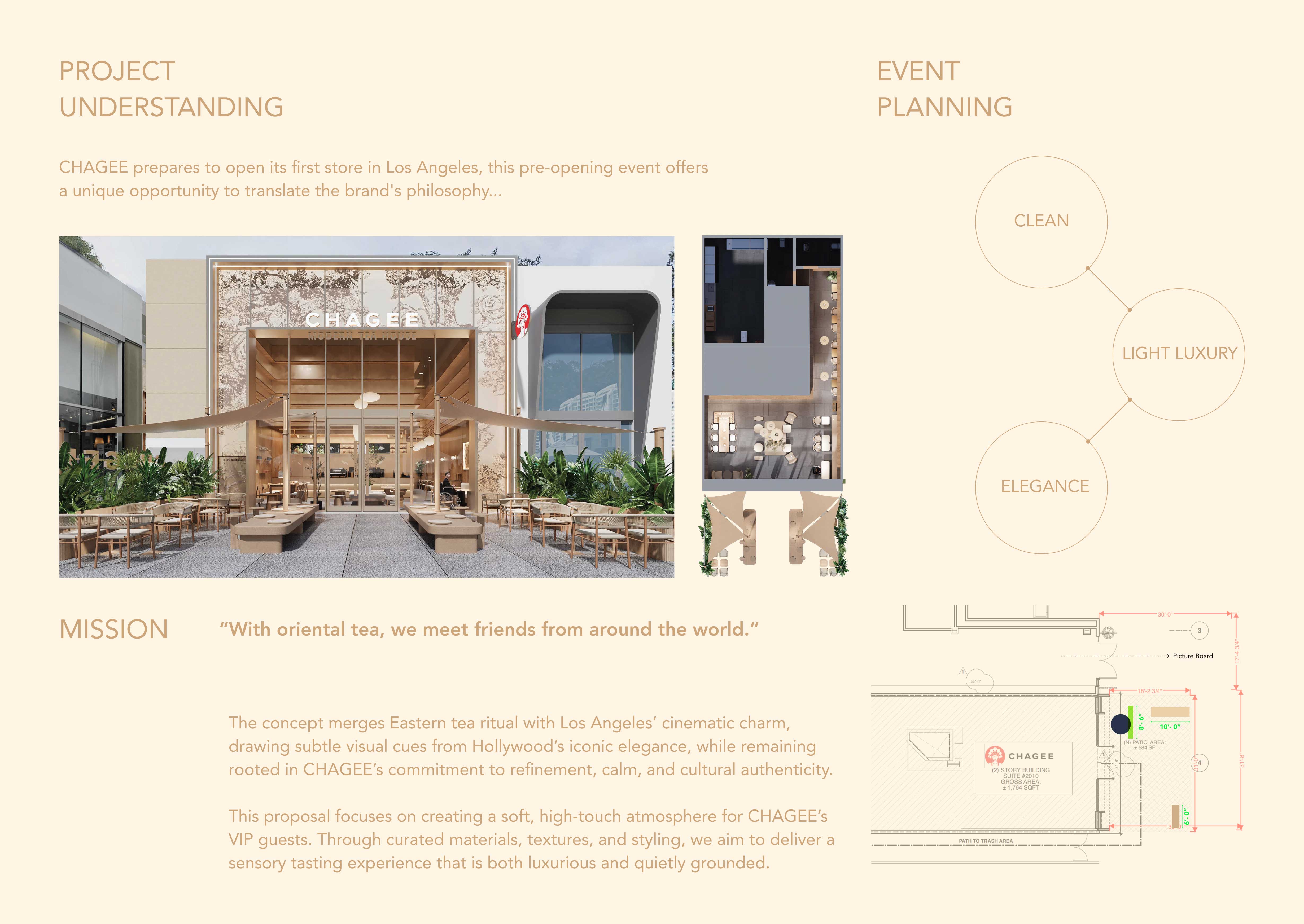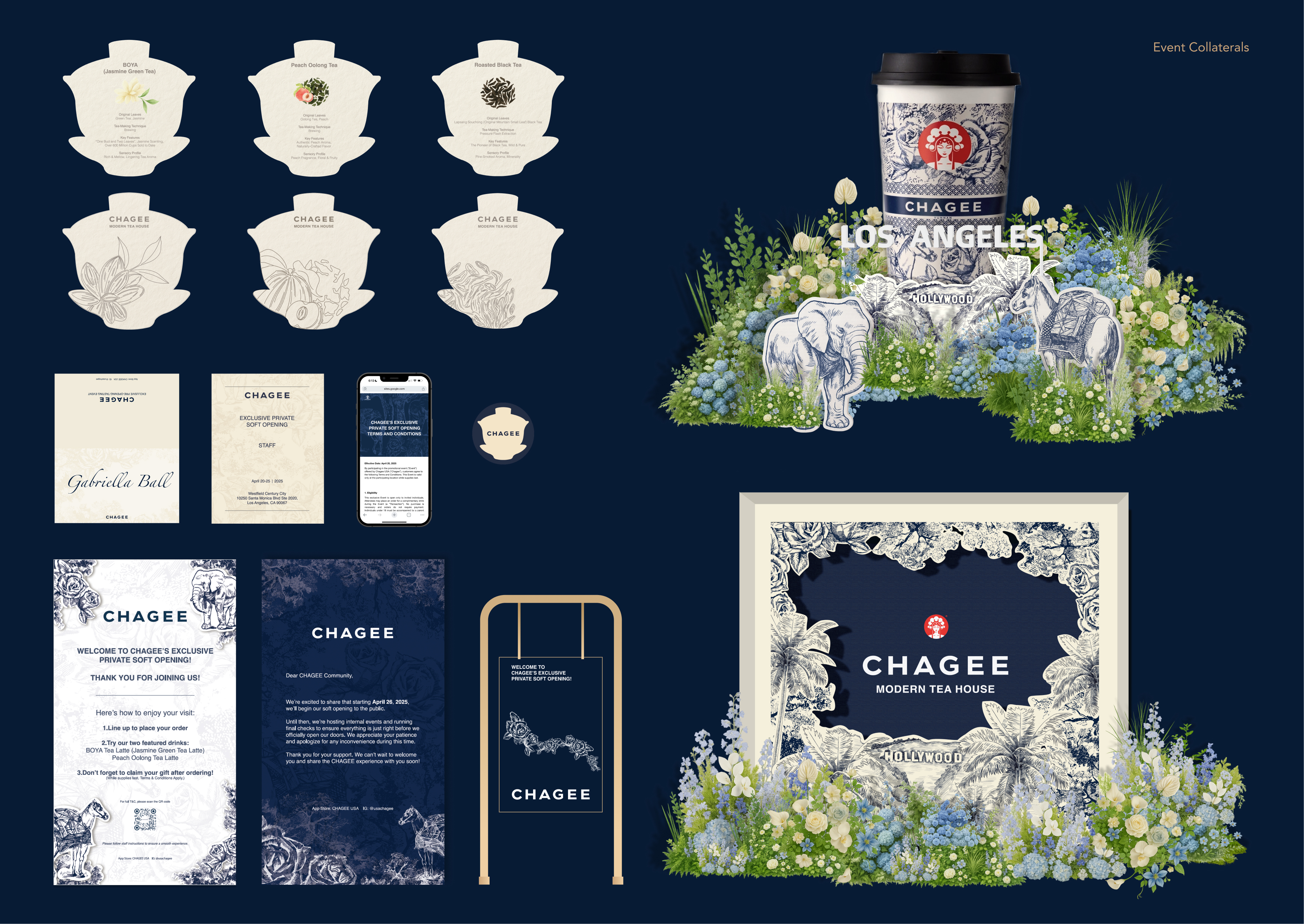 CHAGEE’s first North American store opening at Westfield Century City Mall in Los Angeles presented an opportunity to translate the brand’s philosophy into a holistic experience. The concept merged Eastern tea rituals with LA’s cinematic charm, balancing Hollywood’s elegance with CHAGEE’s values of refinement and authenticity. The project included event visual identity, catering display, floral arrangements, tea card and Event Signage design, and an instructional microsite—together creating a cohesive atmosphere that bridged tradition and modernity, and celebrated the exchange and integration of cultures.