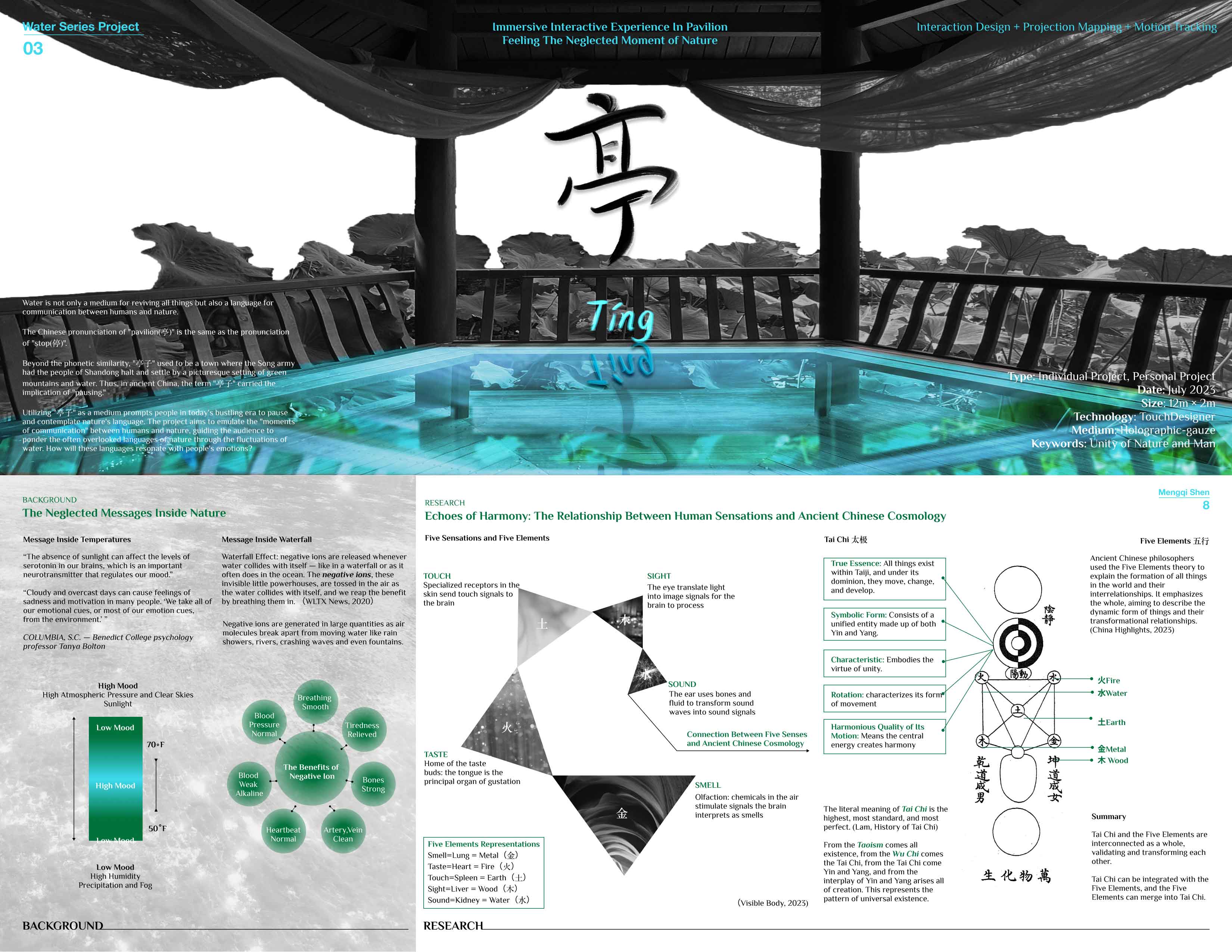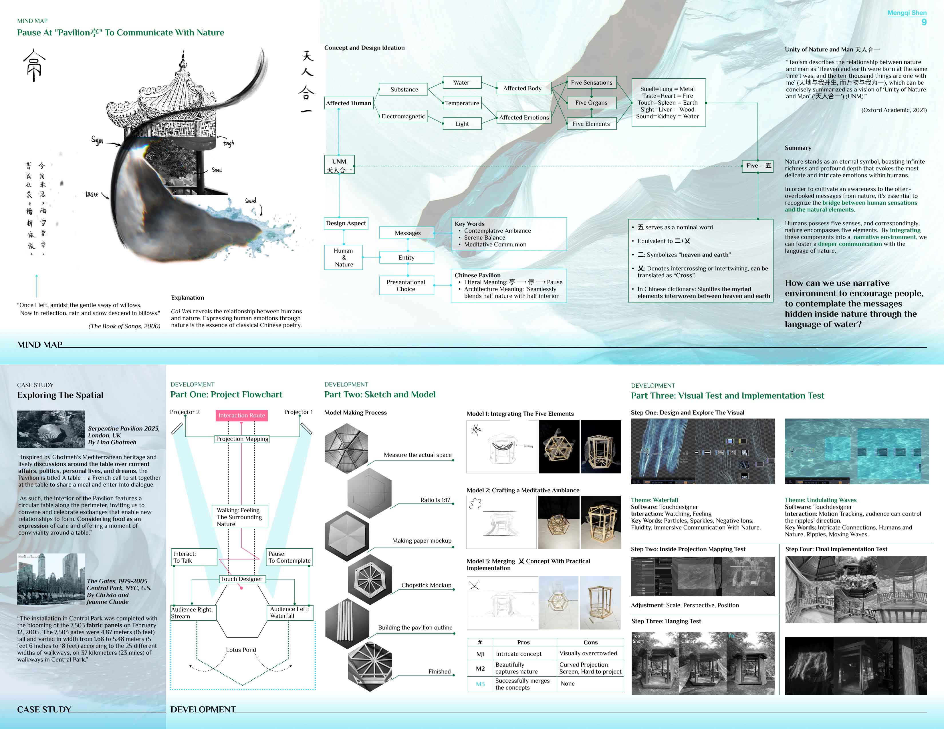 Water is both a life-giving medium and a language between humans and nature. In Chinese, pavilion (亭) shares its sound with stop (停) and historically implied a pause. This project draws on that symbolism, using the pavilion as a space to slow down and reflect, where the fluctuations of water create moments of dialogue with nature and evoke emotional